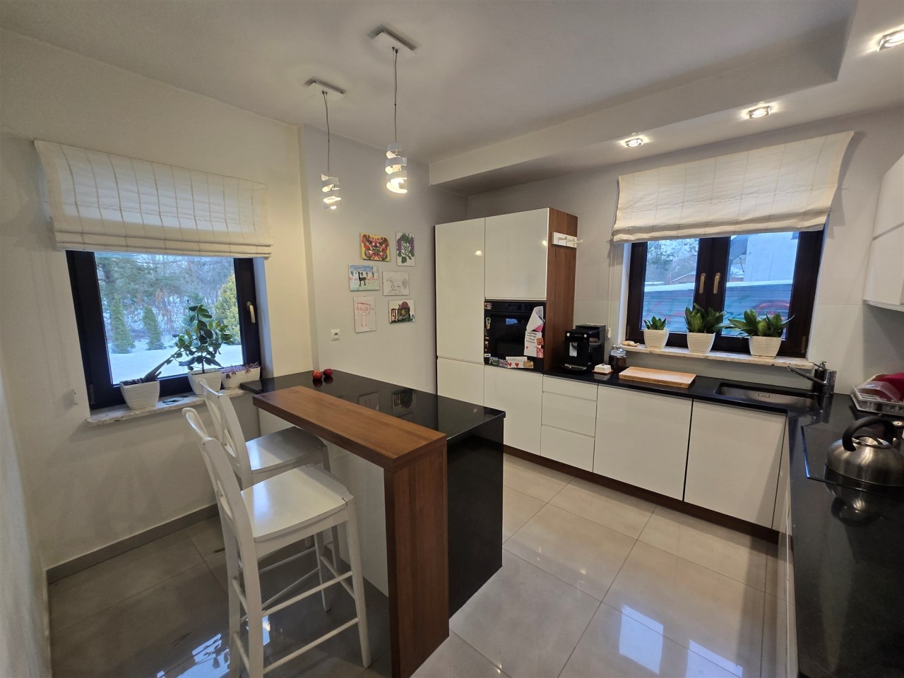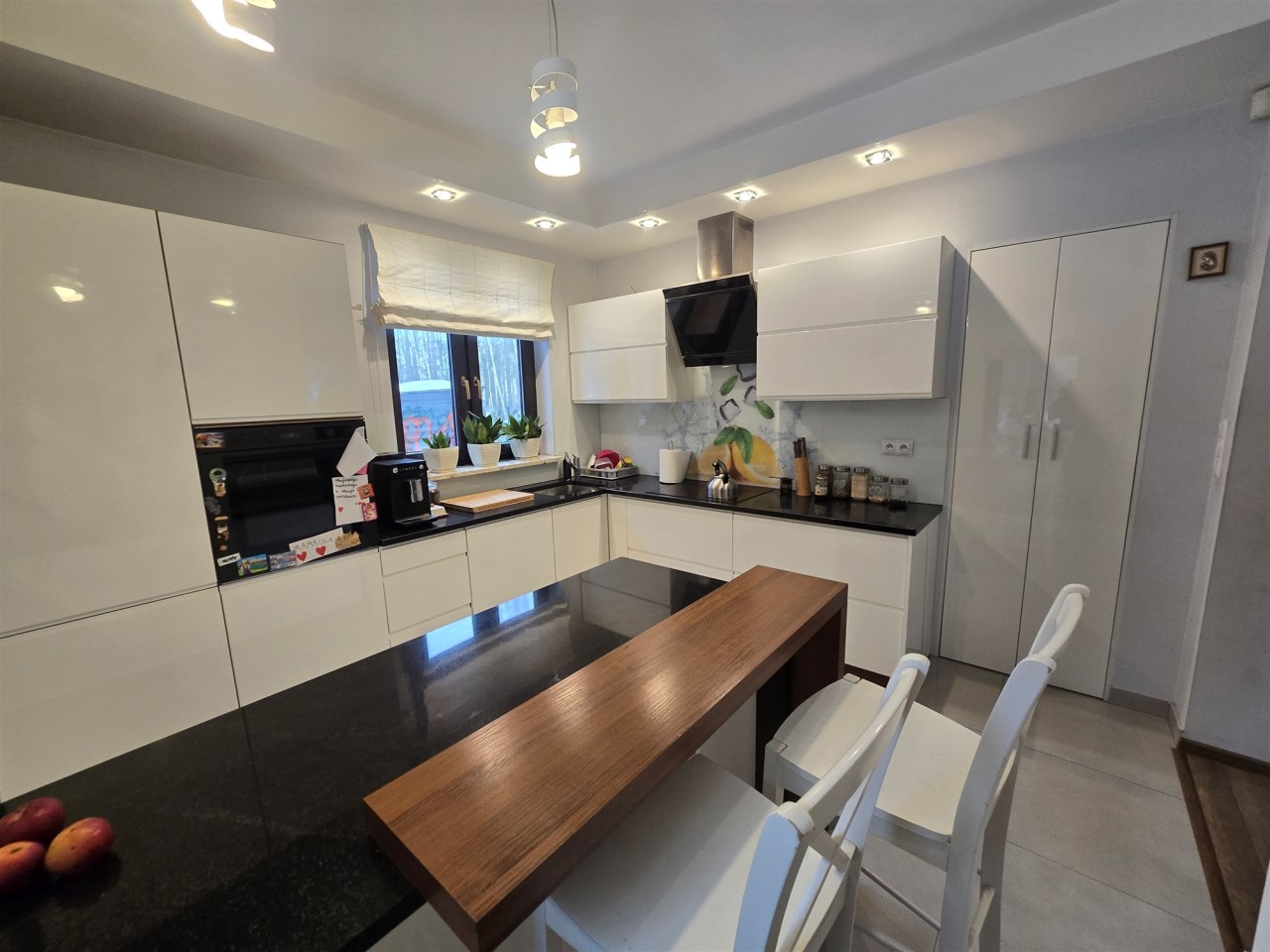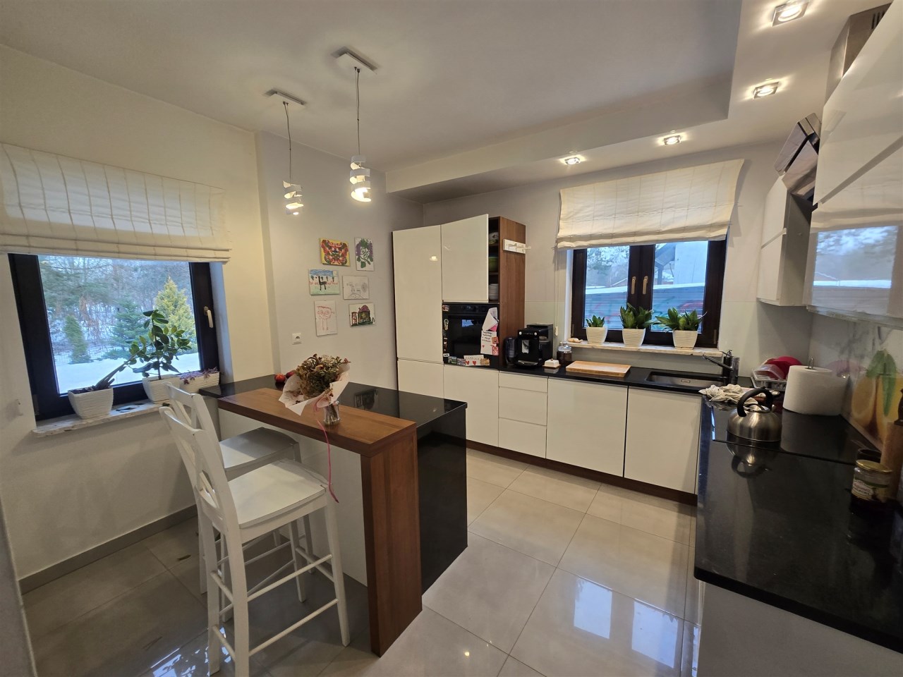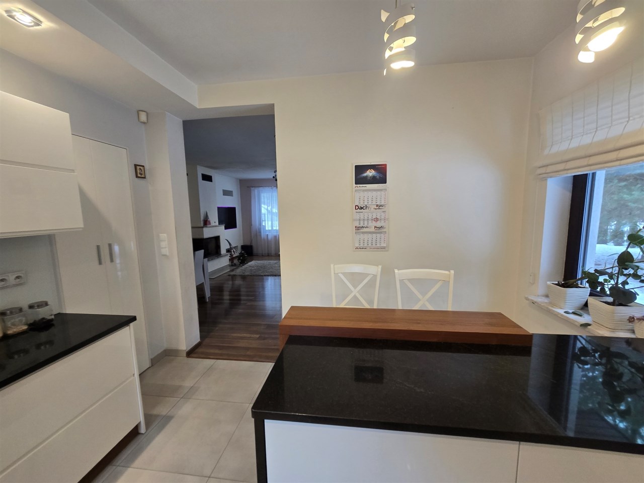 Brama wjazdowa i garażowa na pilota, dom posiada wbudowaną instalację centralnego odkurzacza, zestaw filtrów do uzdatniania wody. Kuchnia pozostaje w pełni umeblowana i wyposażona w sprzęt AGD, z salonu prowadzi wyjście na taras z widokiem na las.