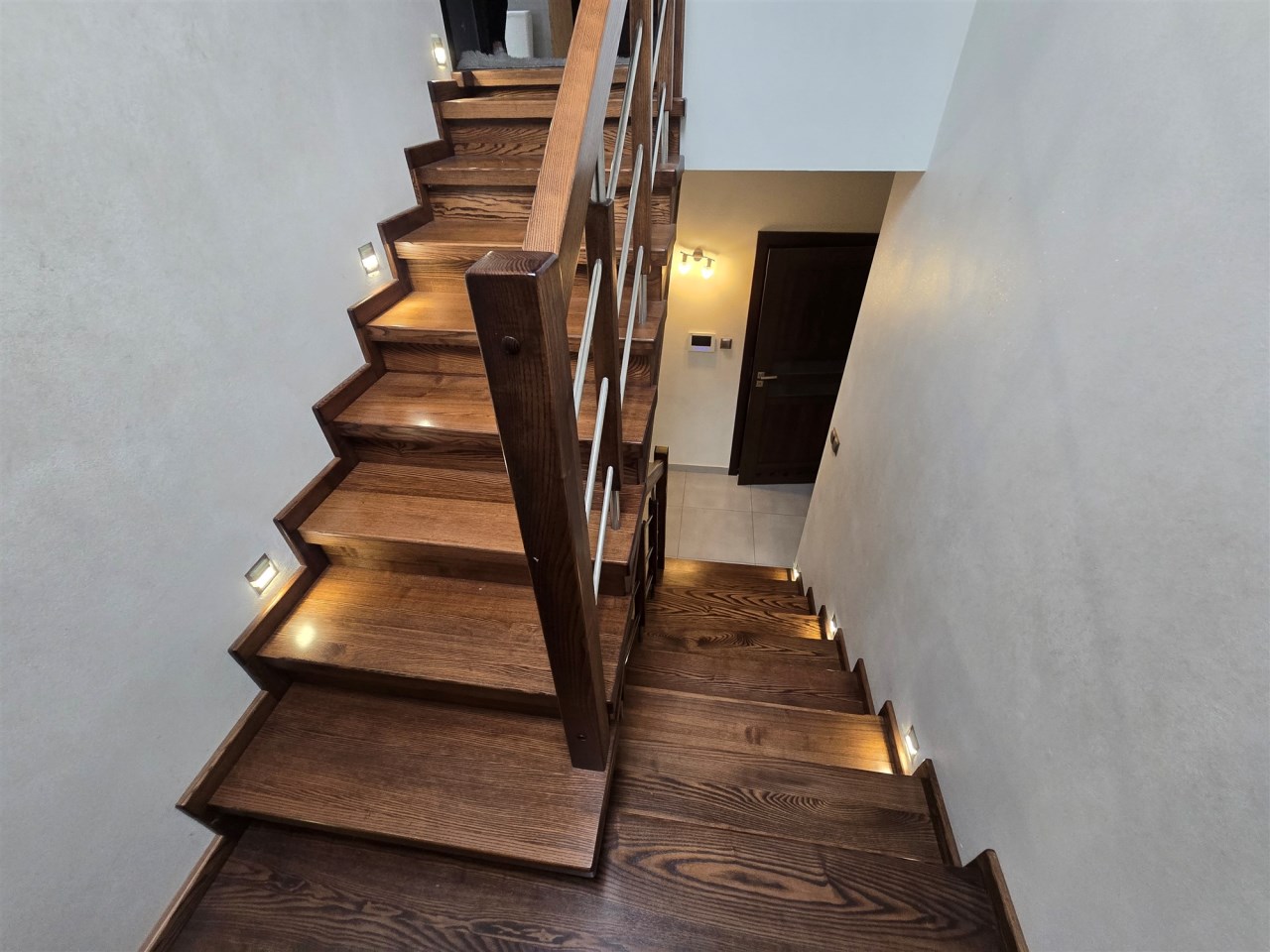 Schody na piętro z litego drewna, na podłogach panele podłogowe.