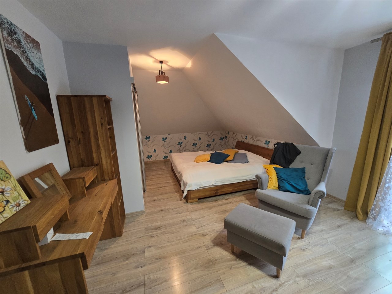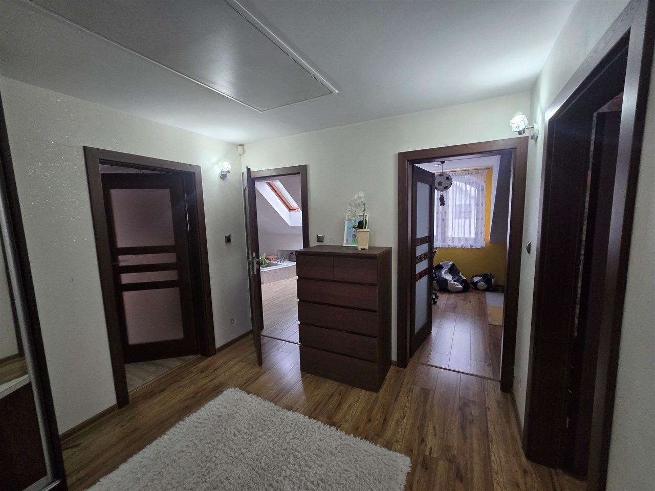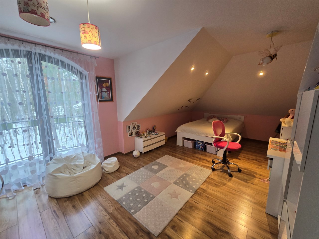 Poddasze użytkowe to część prywatna dla domu. Znajdują się tam 3 sypialne. Główna sypialnia posiada balkon i garderobę natomiast jedna z 2 pozostałych, dużych sypialni posiada również balkon.