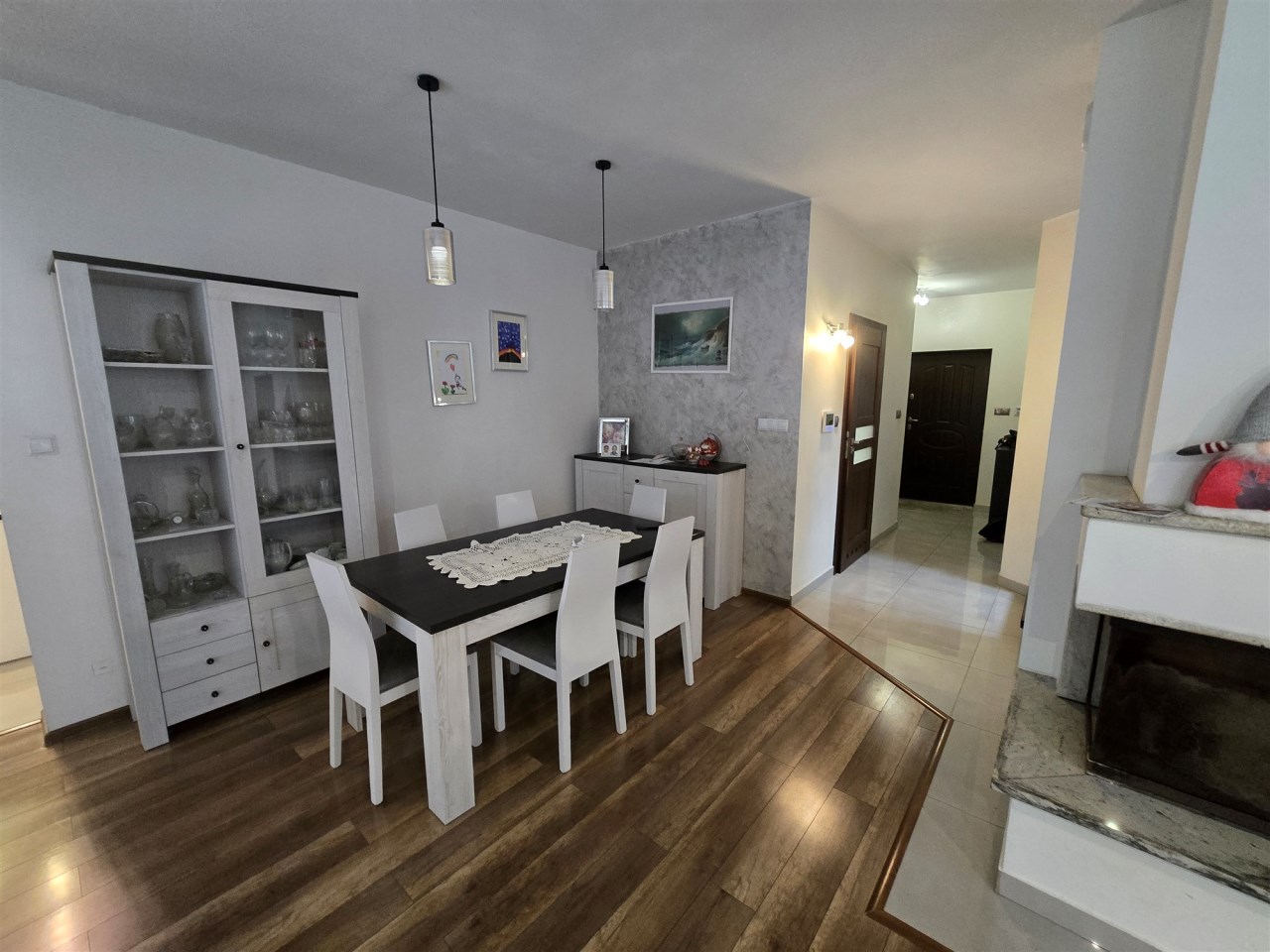 Narożny kominek z dystrybucją gorącego powietrza na piętro domu, w budynku zainstalowany system alarmowy, furtka na domofon.