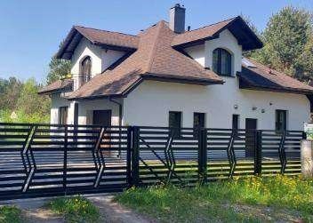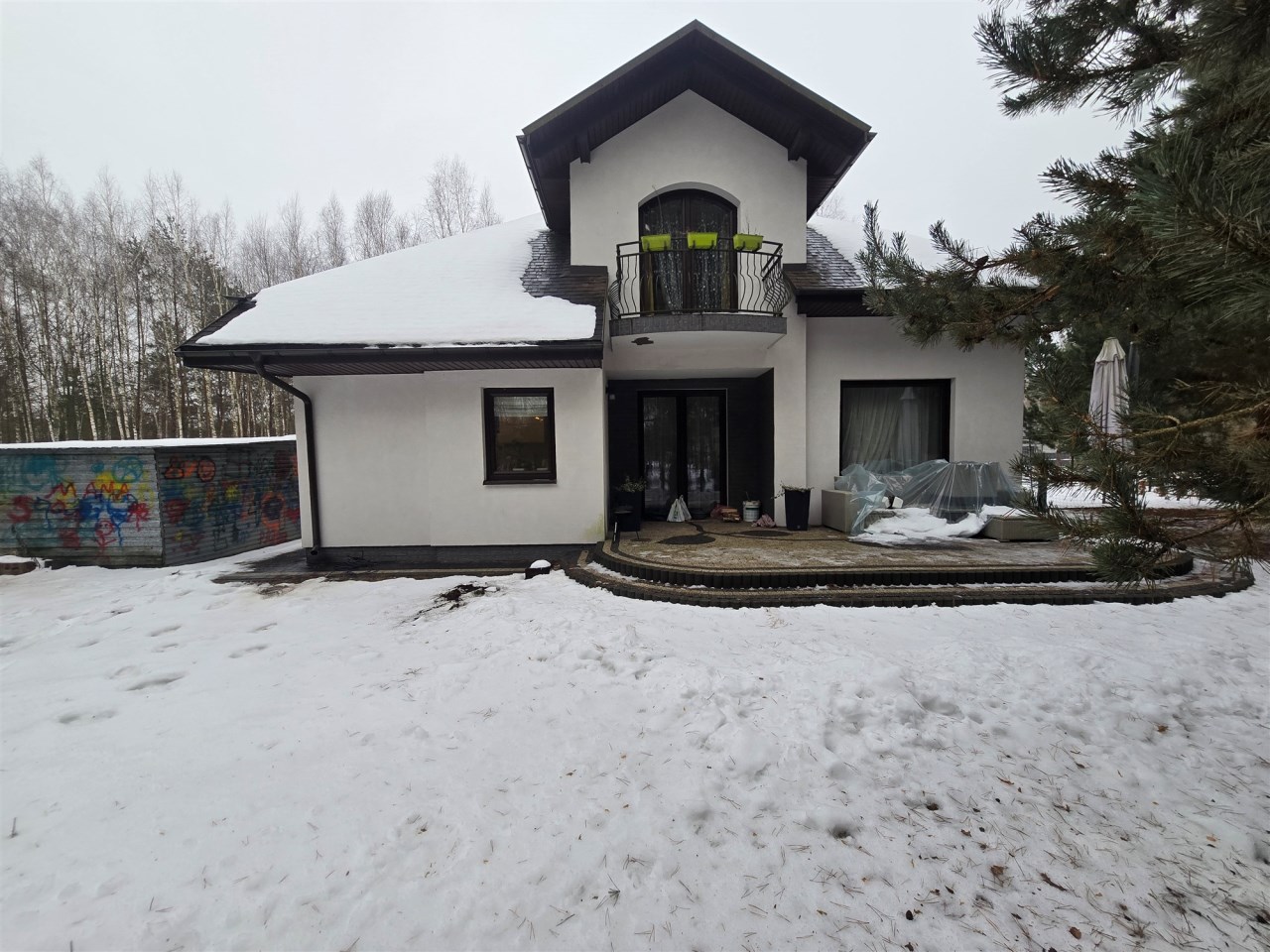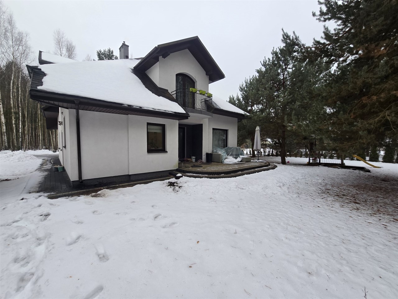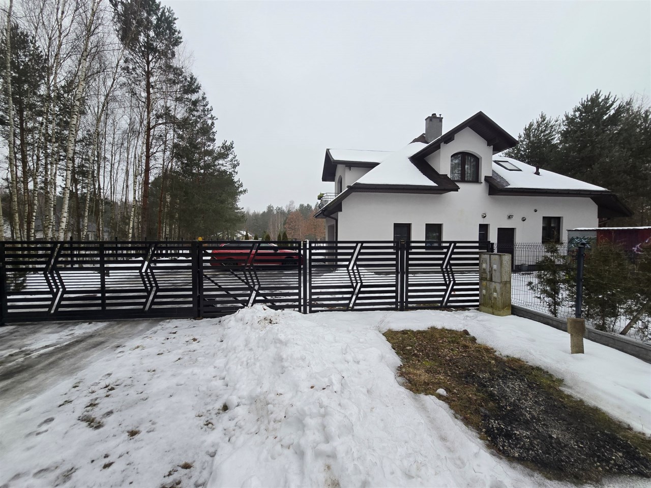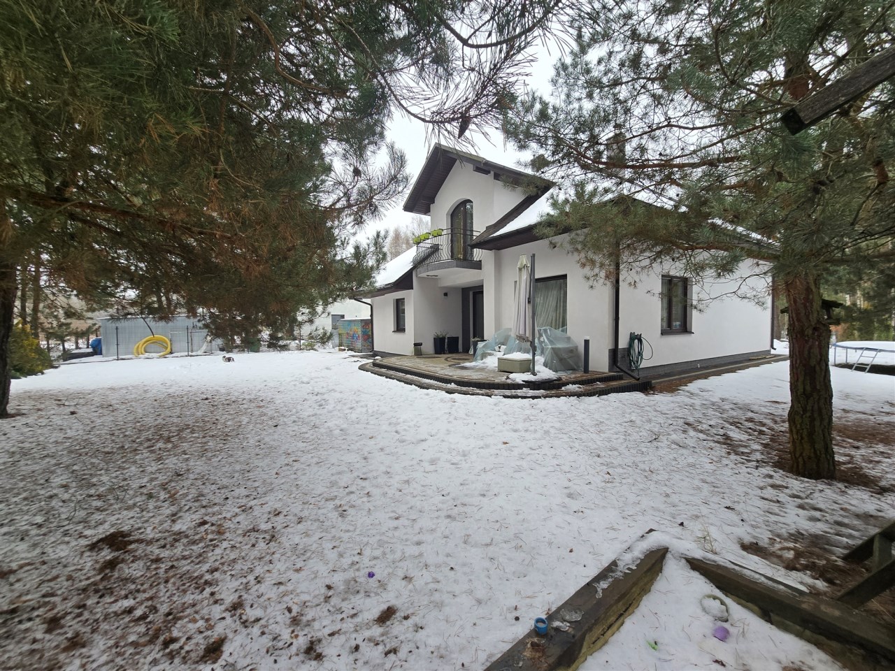 Całość jest ogrodzona ogrodzeniem panelowym. Kilka dużych sosen oraz krzewy i drzewka ozdobne tworzą piękną zieloną przestrzeń wokół domu.