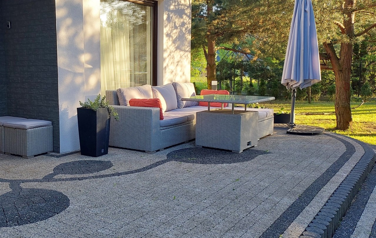 Podjazd przed domem oraz chodniki wokół domu z kostki brukowej.
