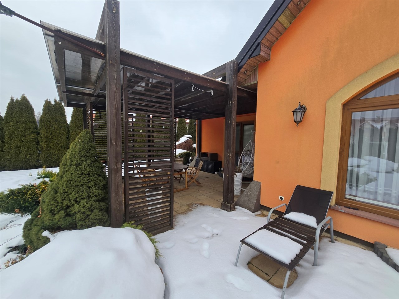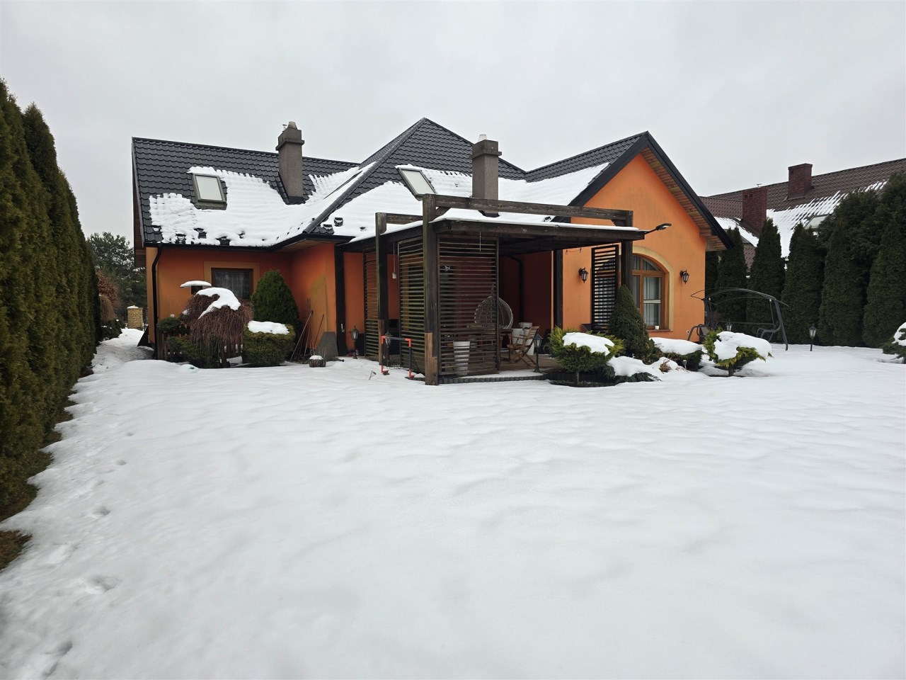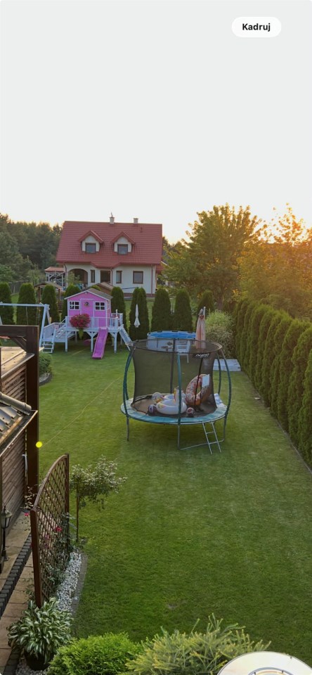 Dom częściowo podpiwniczony, garaż w bryle budynku, za domem duży taras z widokiem na obszerny ogród z zabudową do zabaw dla dzieci.