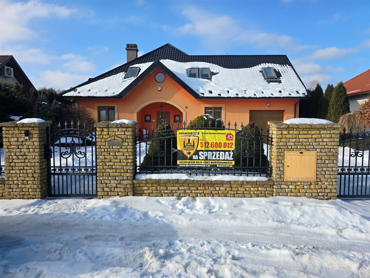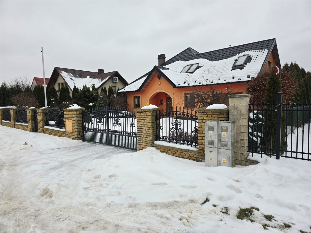 Wokół domu chodnik z kostki brukowej. Ogrodzenie frontowe kute.
