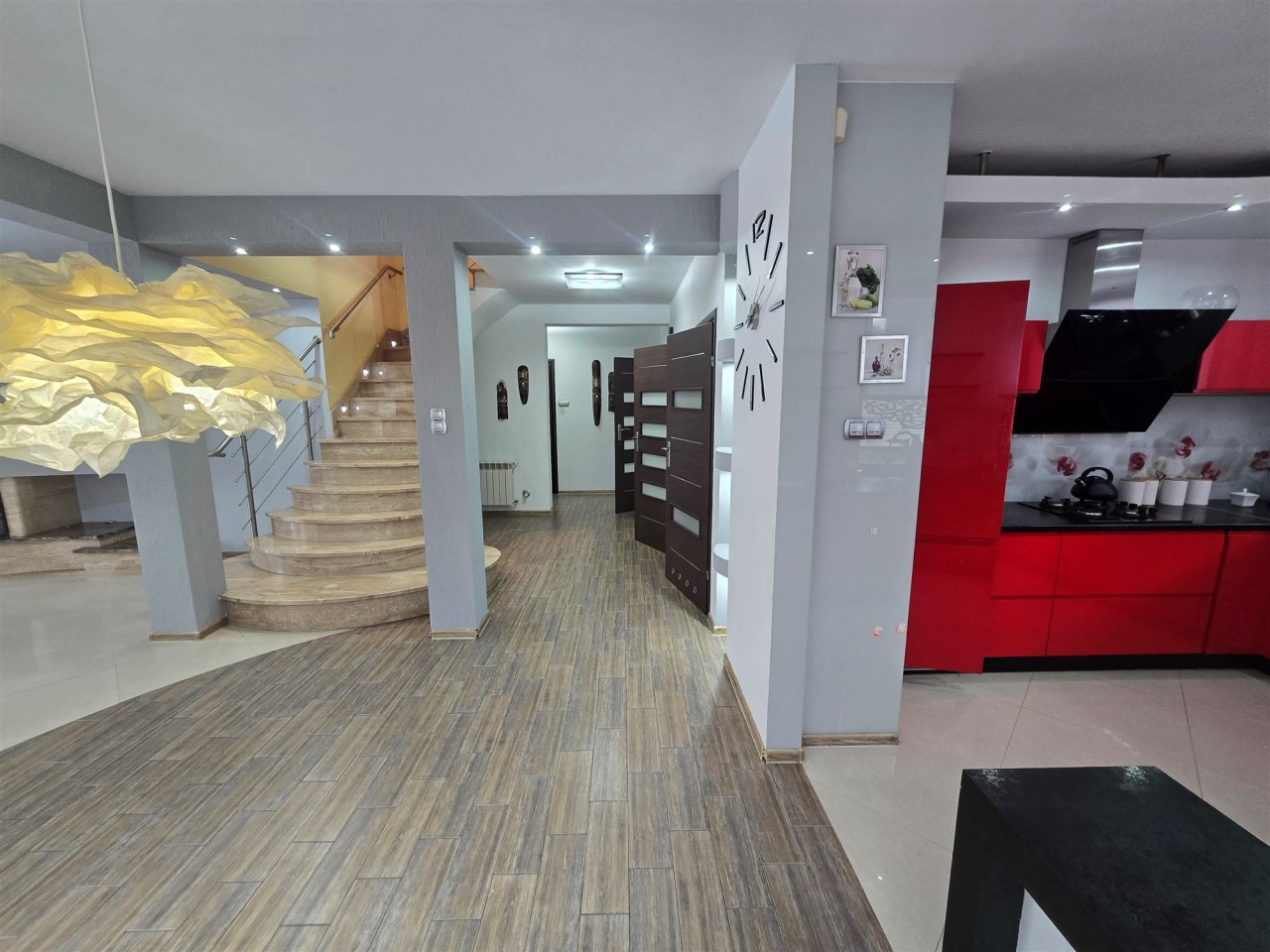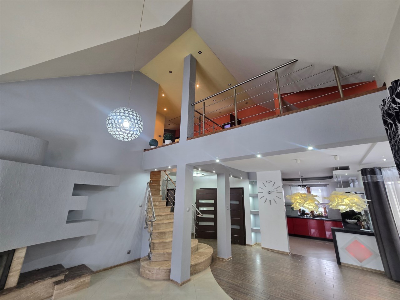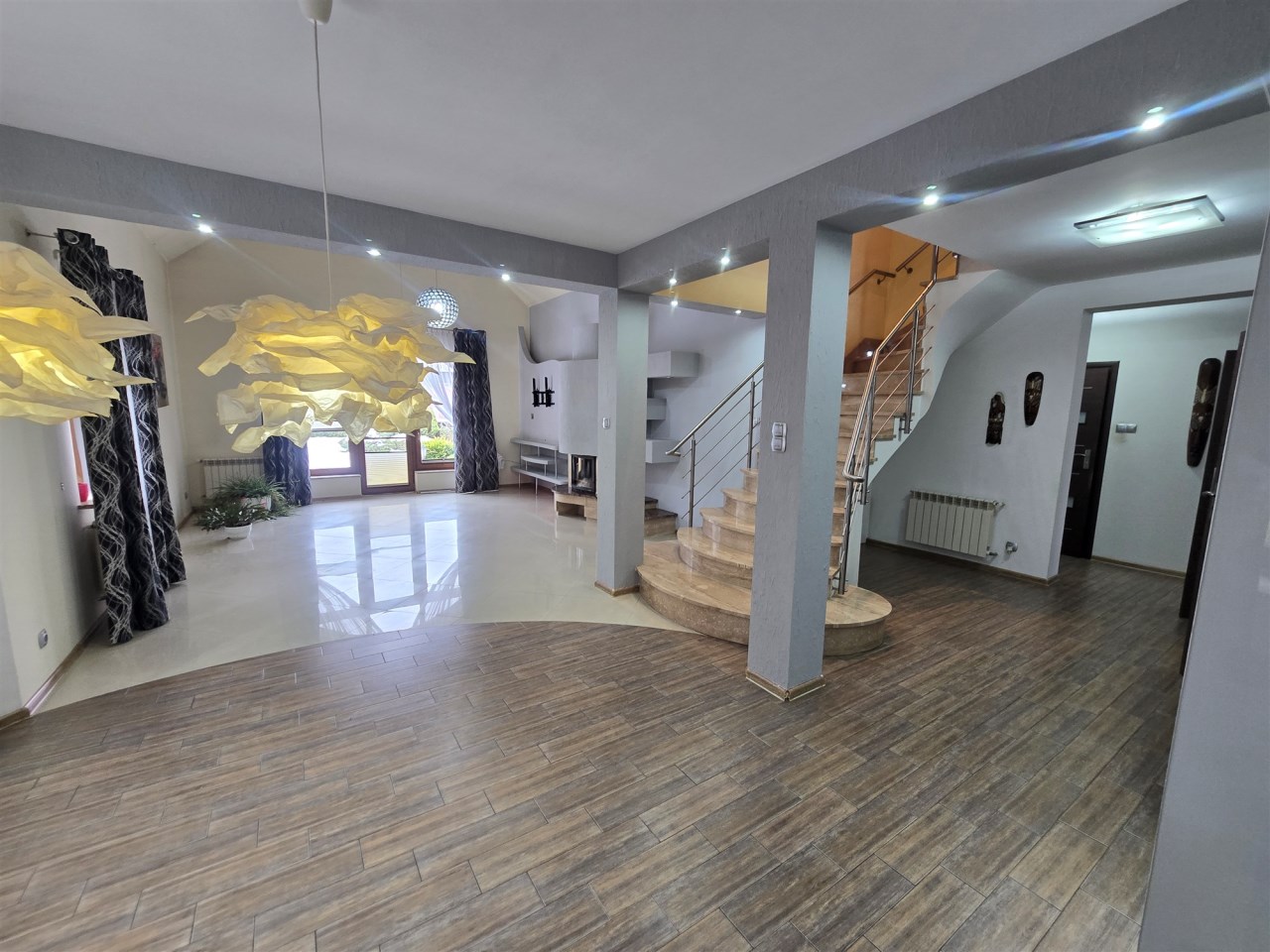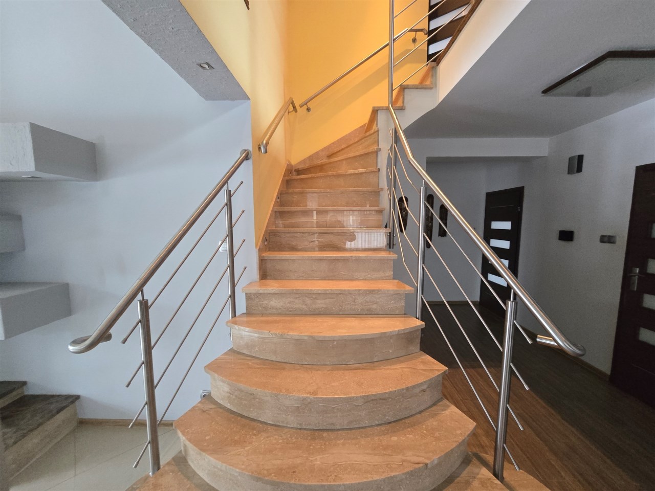Na piętro prowadzą schody marmurowe z podświetleniem LED, na piętrze znajdują się 3 sypialnie, hol oraz duża łazienka, salon zatem z piętrem zwieńczony jest antresolą, co stanowi urozmaiconą architekturę wewnętrzną.
