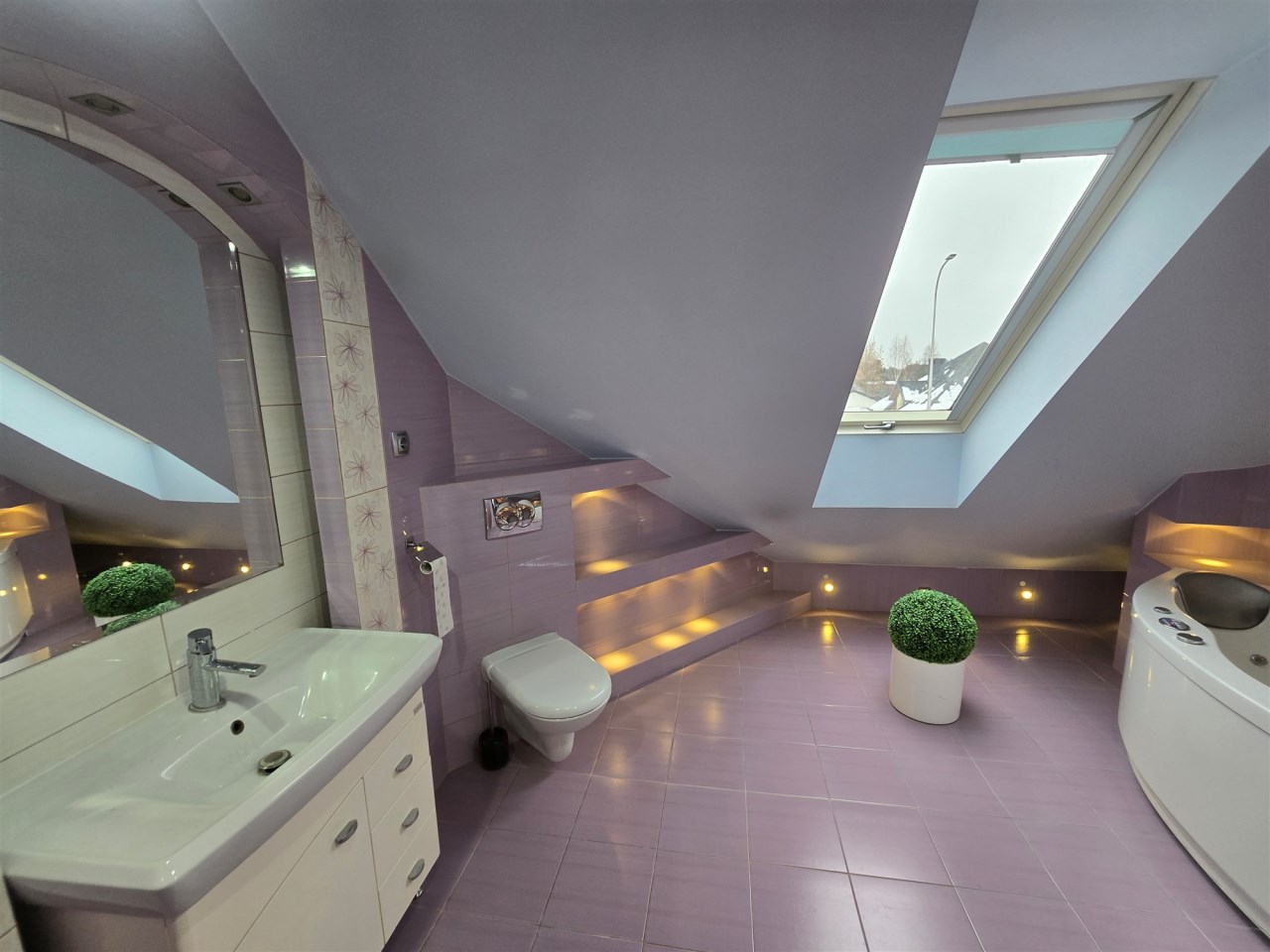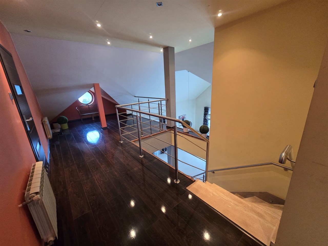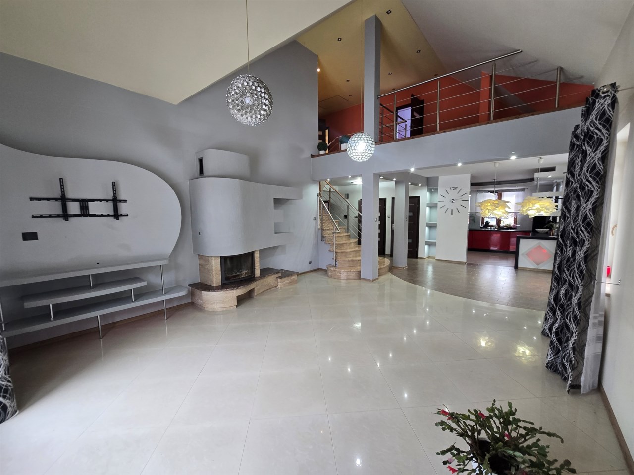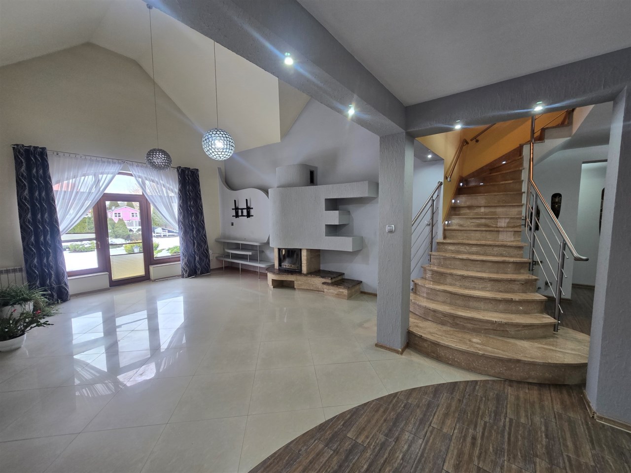 Na piętro prowadzą schody marmurowe z podświetleniem LED, na piętrze znajdują się 3 sypialnie, hol oraz duża łazienka, salon zatem z piętrem zwieńczony jest antresolą, co stanowi urozmaiconą architekturę wewnętrzną.