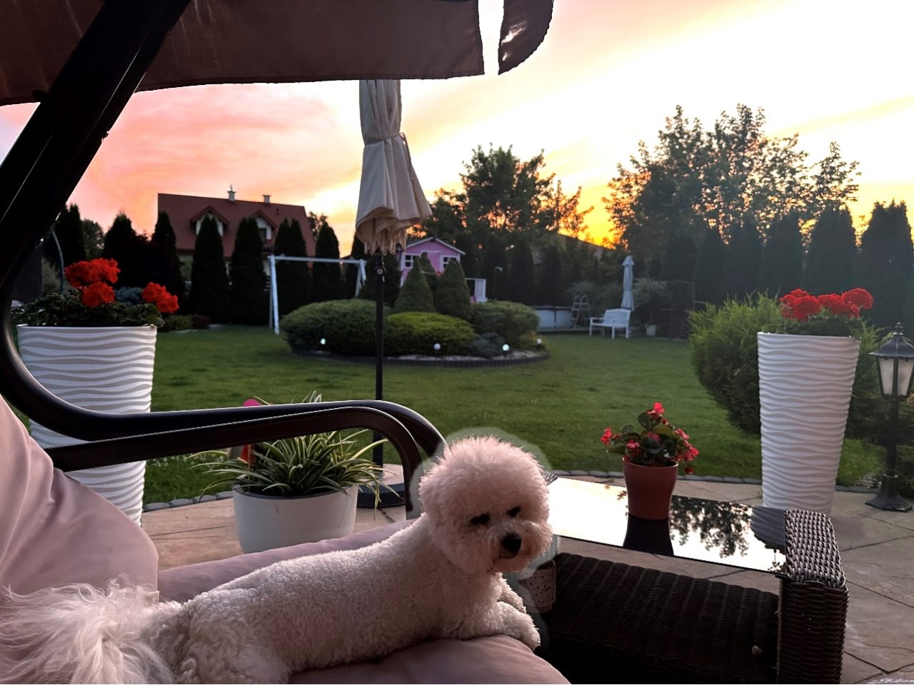 Ogród z nawodnieniem. Taras zabudowany altaną, dach kryty blachodachówką.
