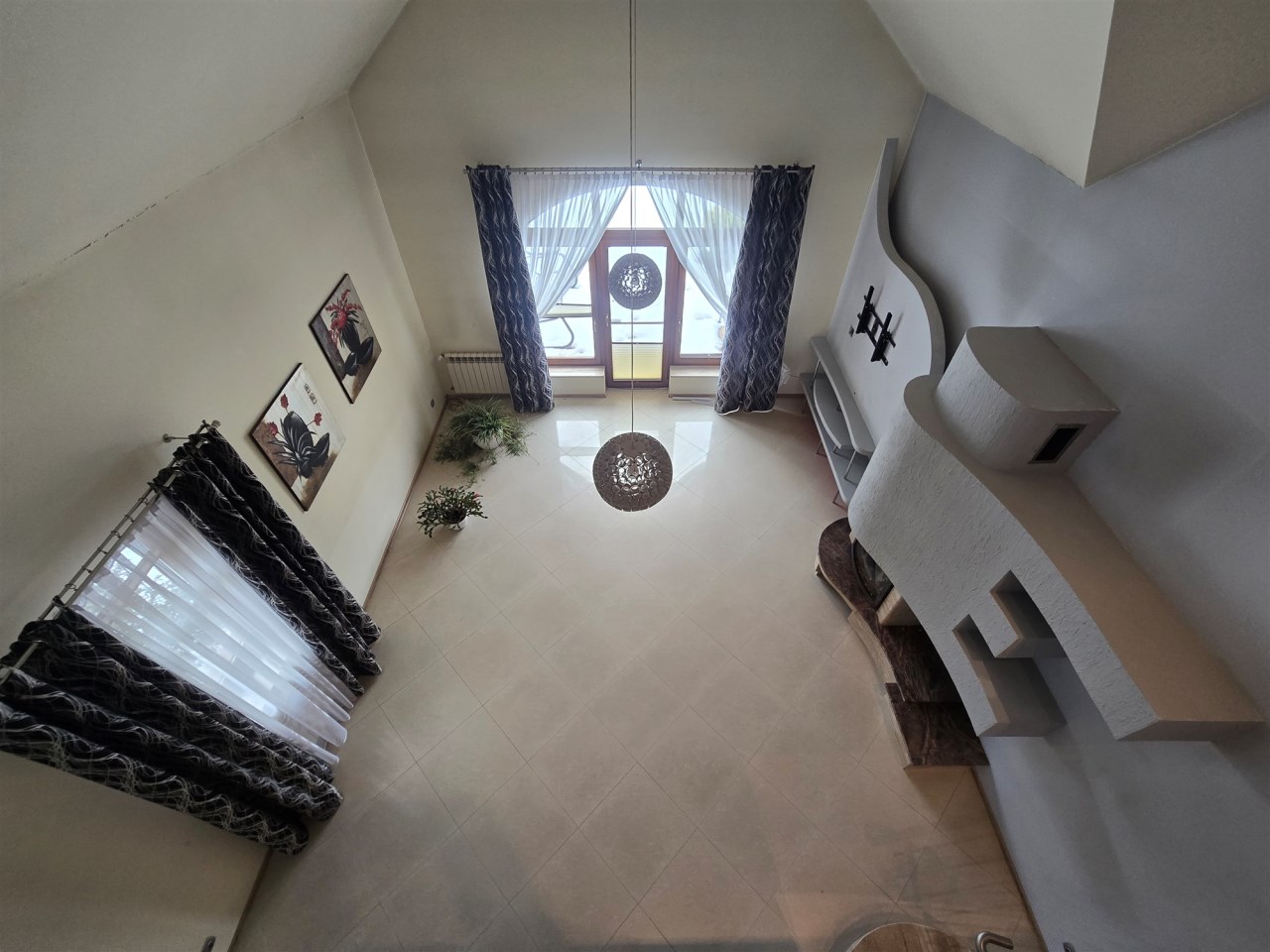 Parter domu to obszerny, wysoki salon/jadalnia z kominkiem, kuchnia otwarta na salon w zabudowie, 2 łazienki, w tym jedna obszerna z wanną oraz 2 sypialnie.