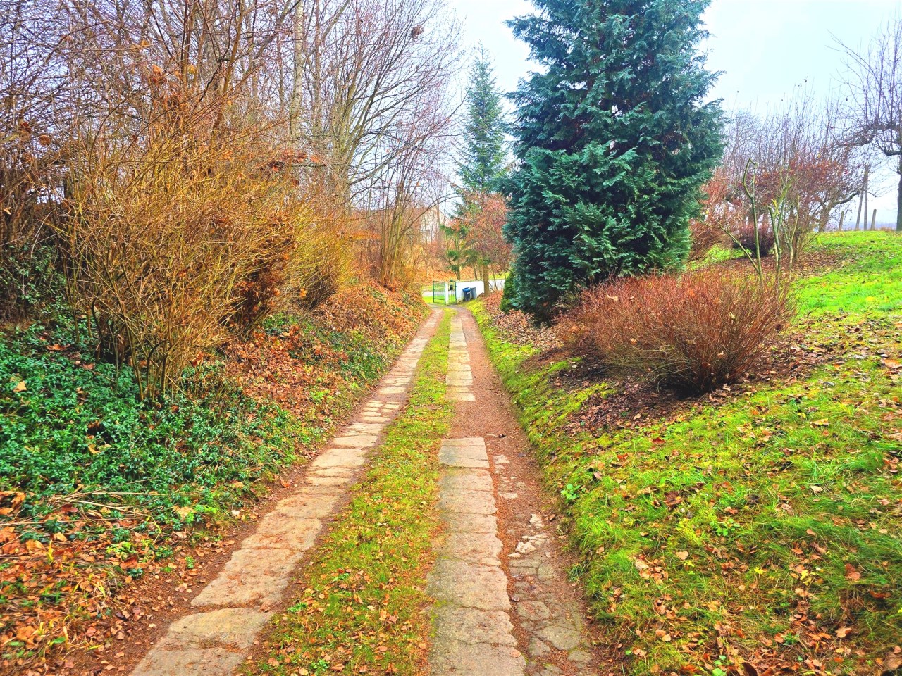 Od bramy wjazdowej do domu prowadzi wąwóz otoczony szpalerem drzew i krzewów, a na końcu kolisty plac