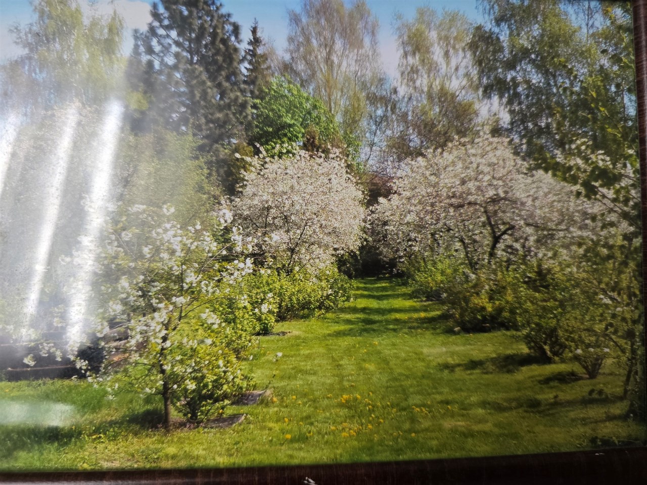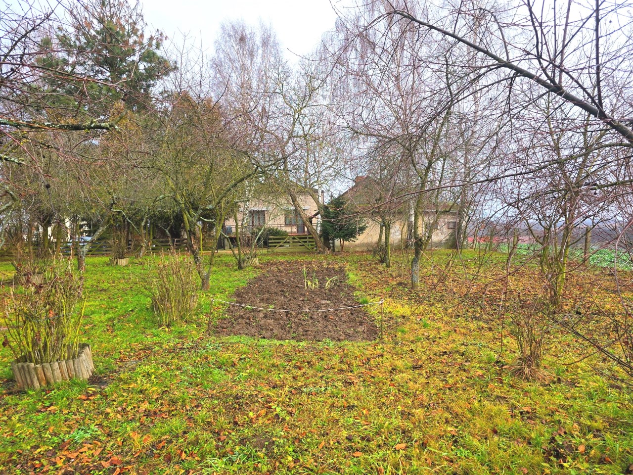 W sadzie drzewa owocowe: jabłonie, śliwy, wiśnie, jabłonie, grusze, krzewy porzeczek.