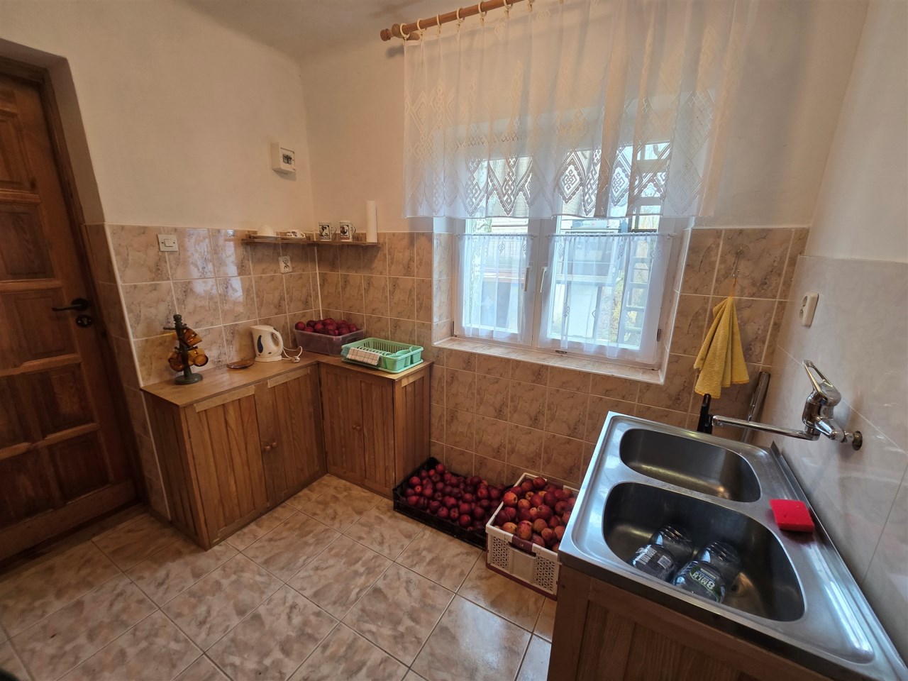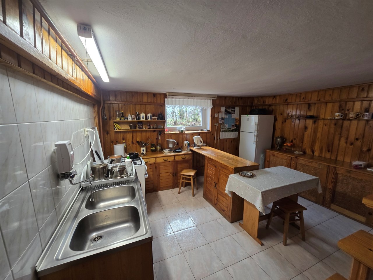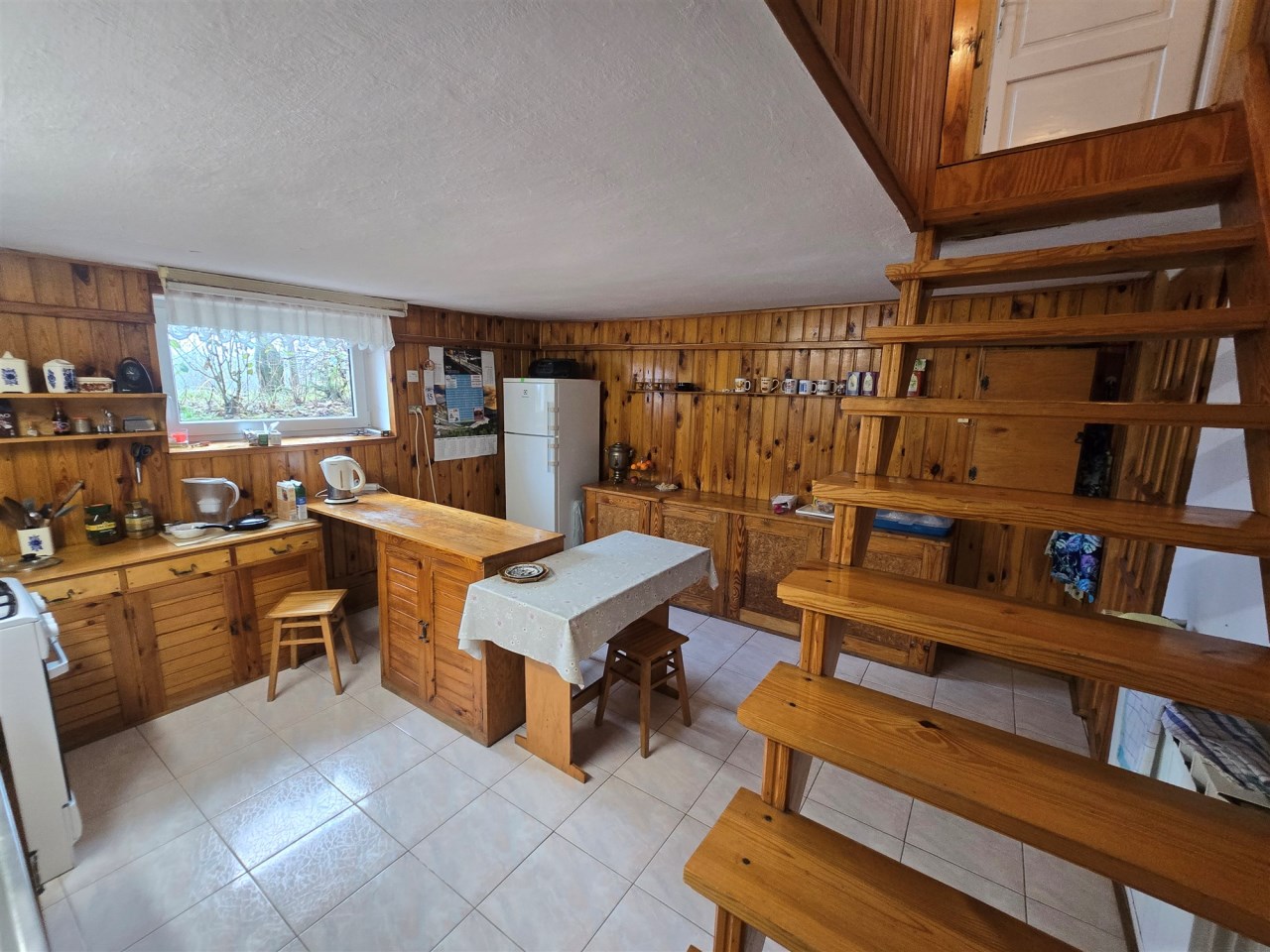 Dalej domek murowany, w którym znajduje się duży pokój, aneks kuchenny oraz łazienka z kabiną prysznicową.