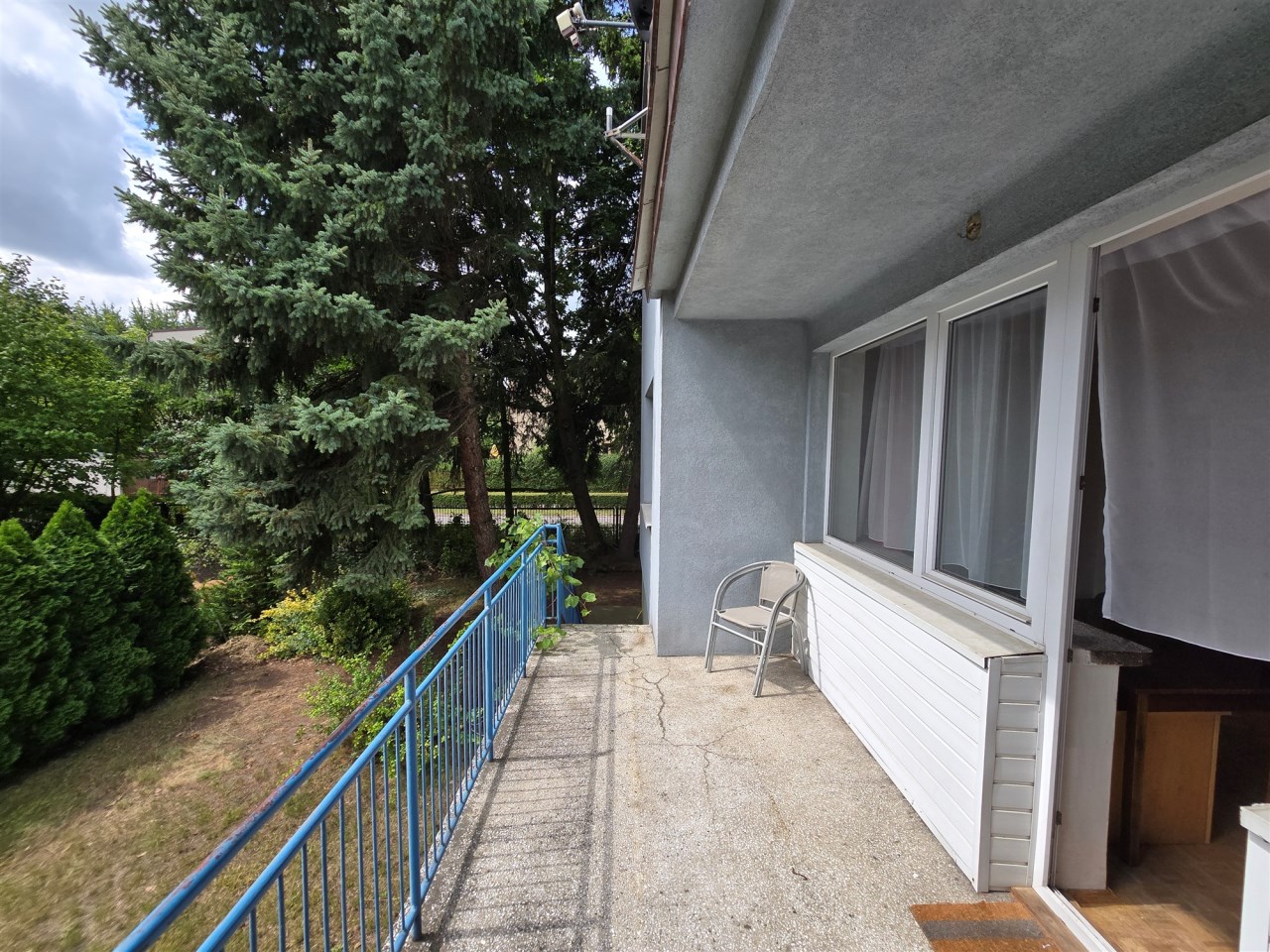 Balkon od strony ogrodu typu loggia ze schodami prowadzącymi w dół.