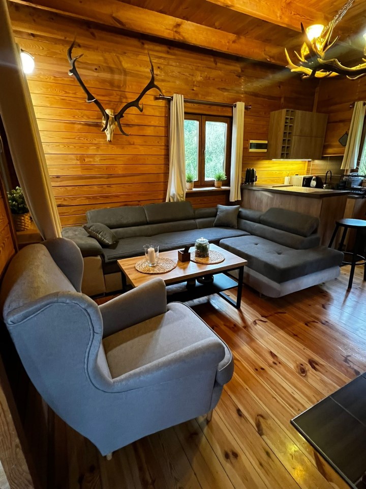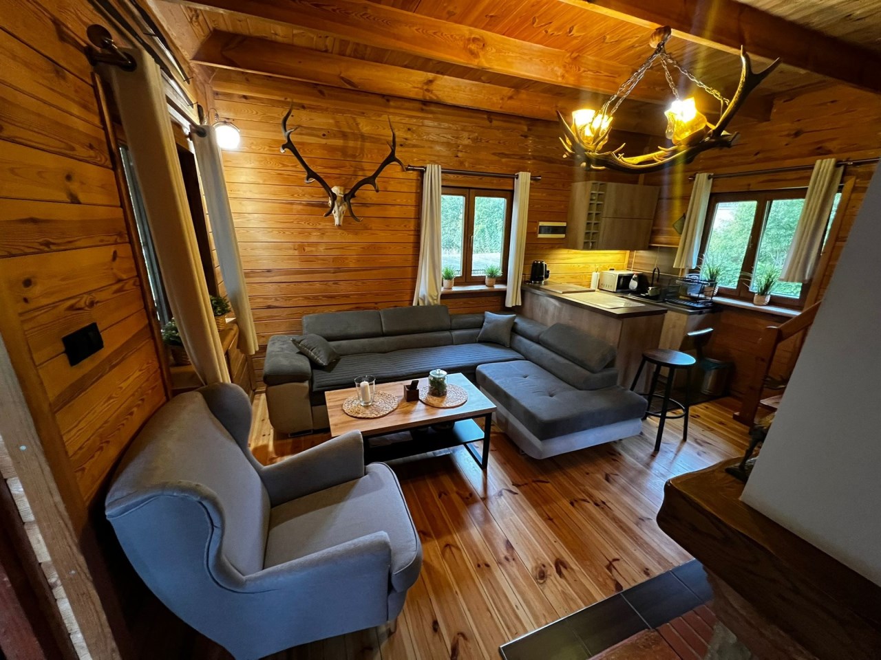W centralnej części salonu kominek będący źródłem ciepła. Aneks kuchenny z elektryczną płytą grzewczą.