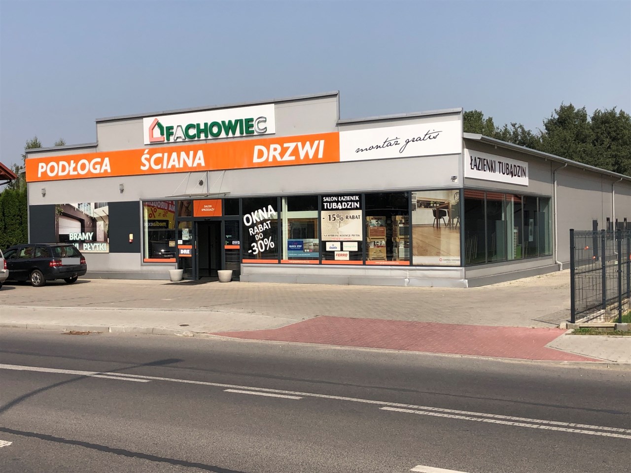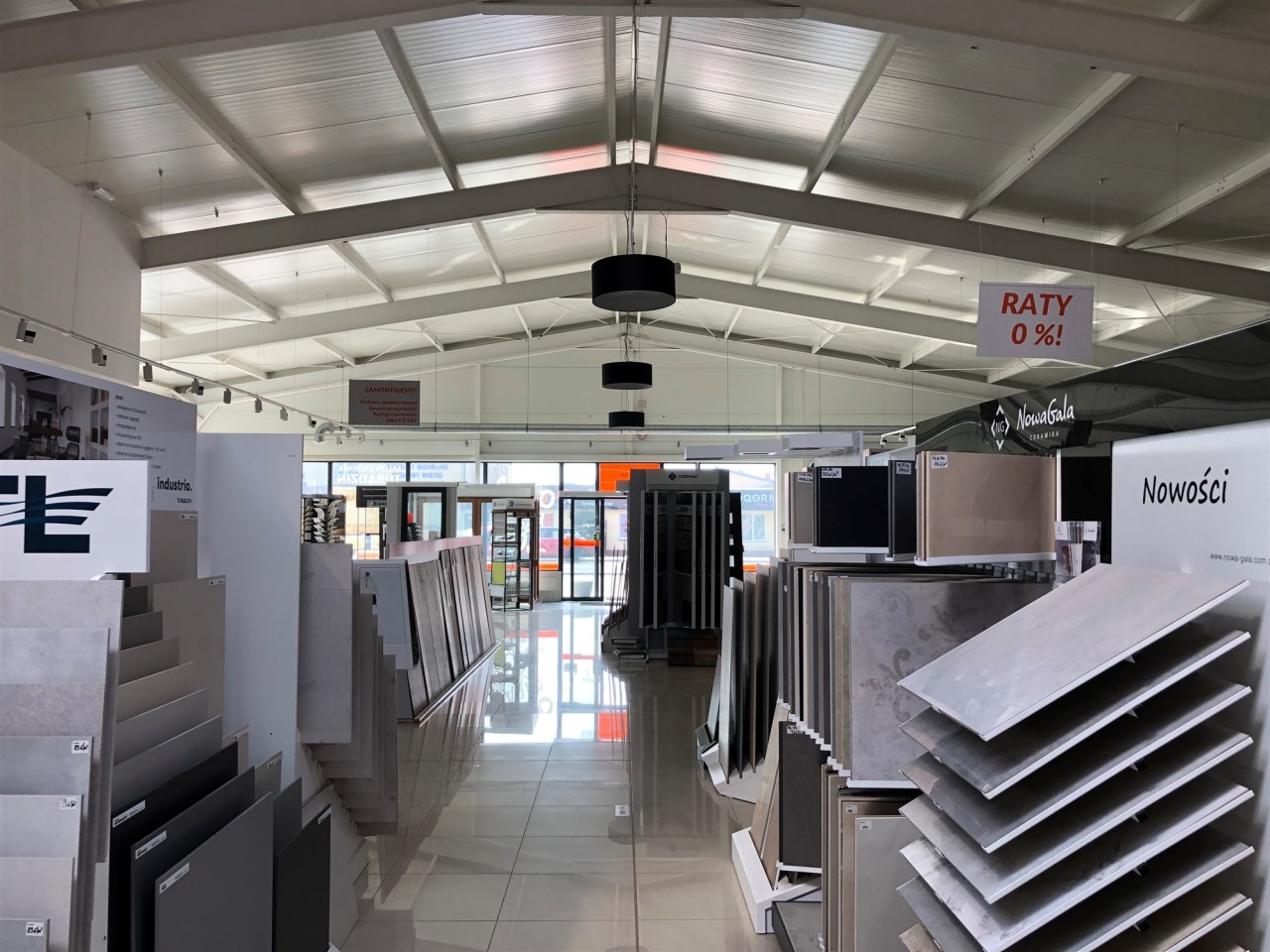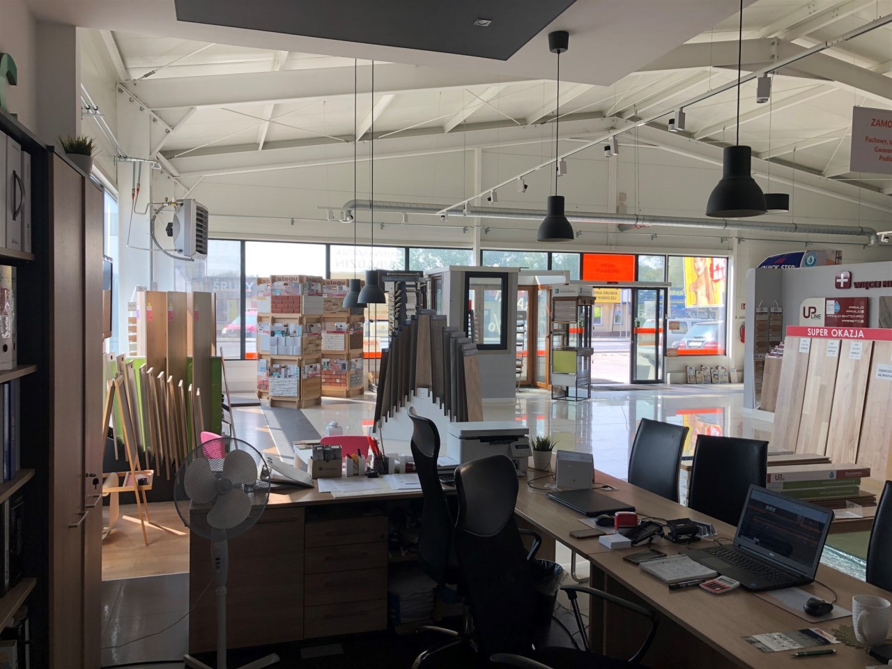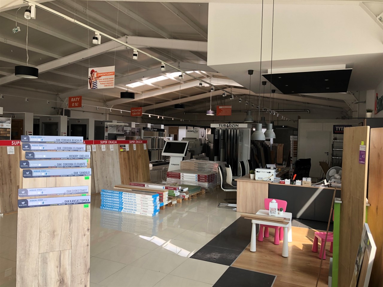 Nowoczesny budynek użytkowy na dużej działce o powierzchni 3500 m2, front budynku przeszklony (duże witryny aluminiowe), drzwi automatyczne, podłoga z nowoczesnej terakoty (duże tafle), ogrzewanie z MEC.