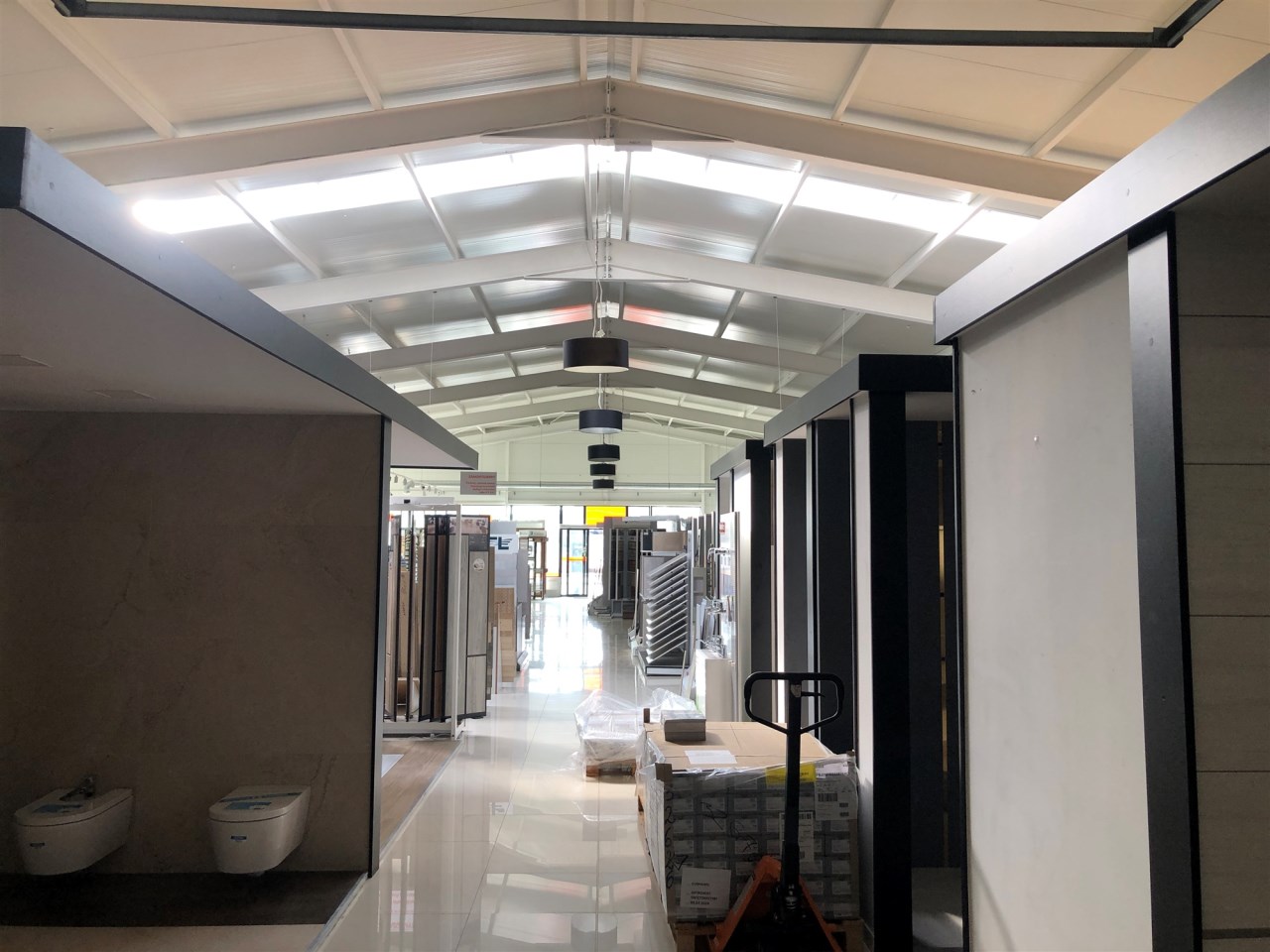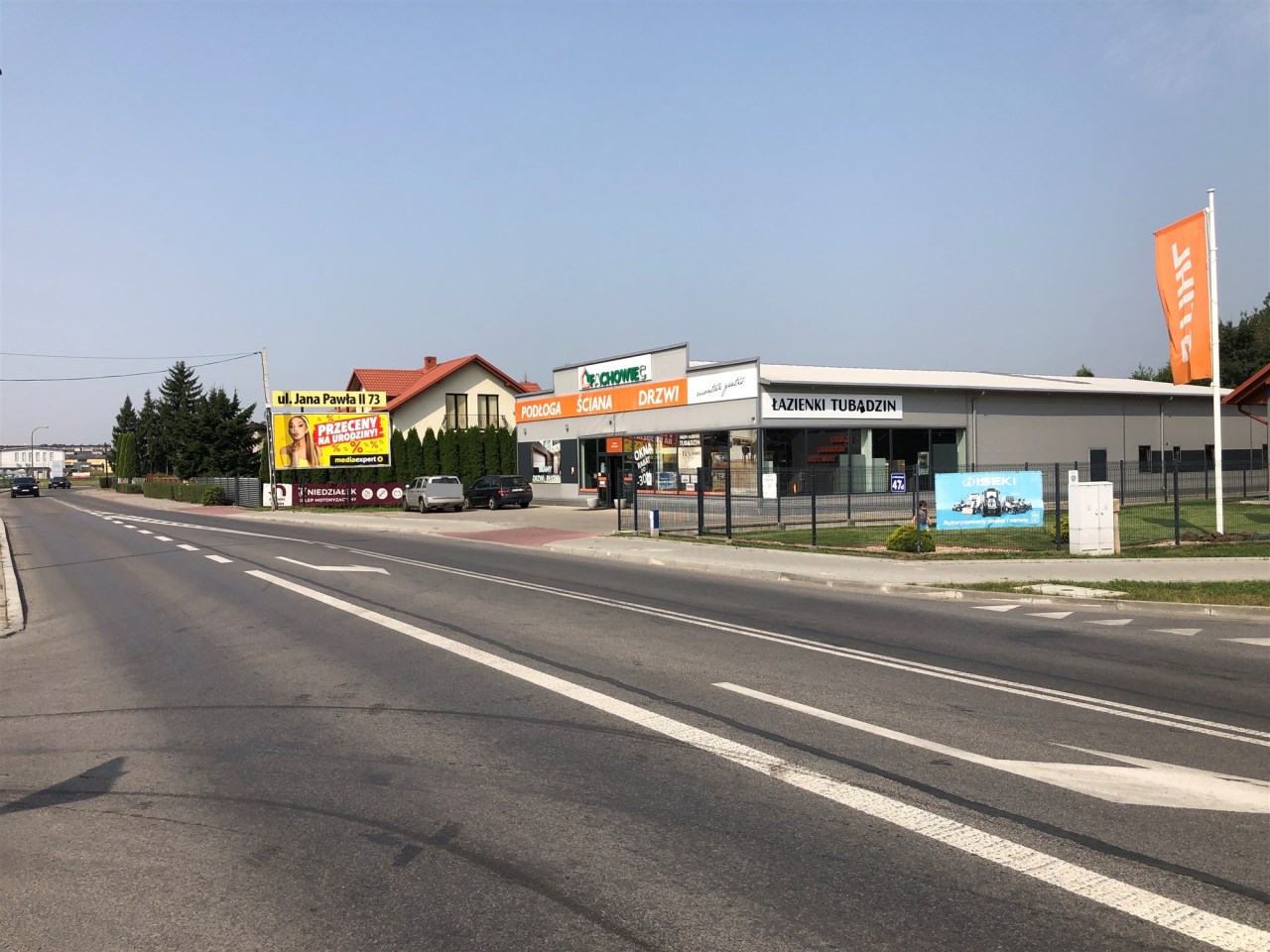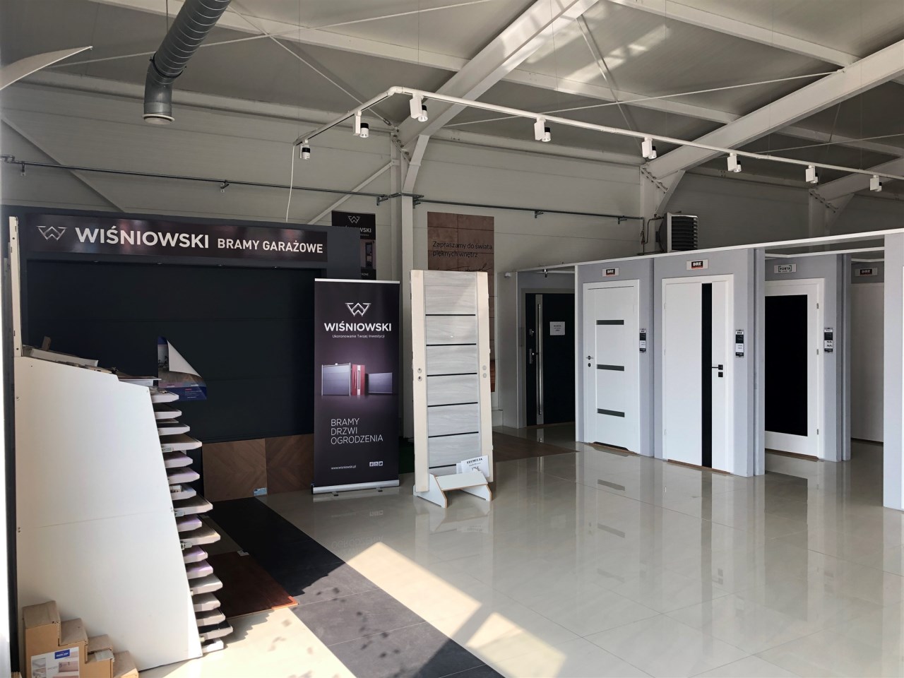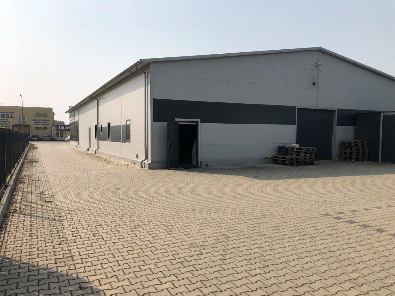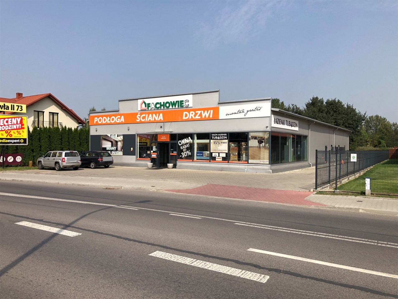 Nowoczesny budynek użytkowy na dużej działce o powierzchni 3500 m2, front budynku przeszklony (duże witryny aluminiowe), drzwi automatyczne, podłoga z nowoczesnej terakoty (duże tafle), ogrzewanie z MEC.