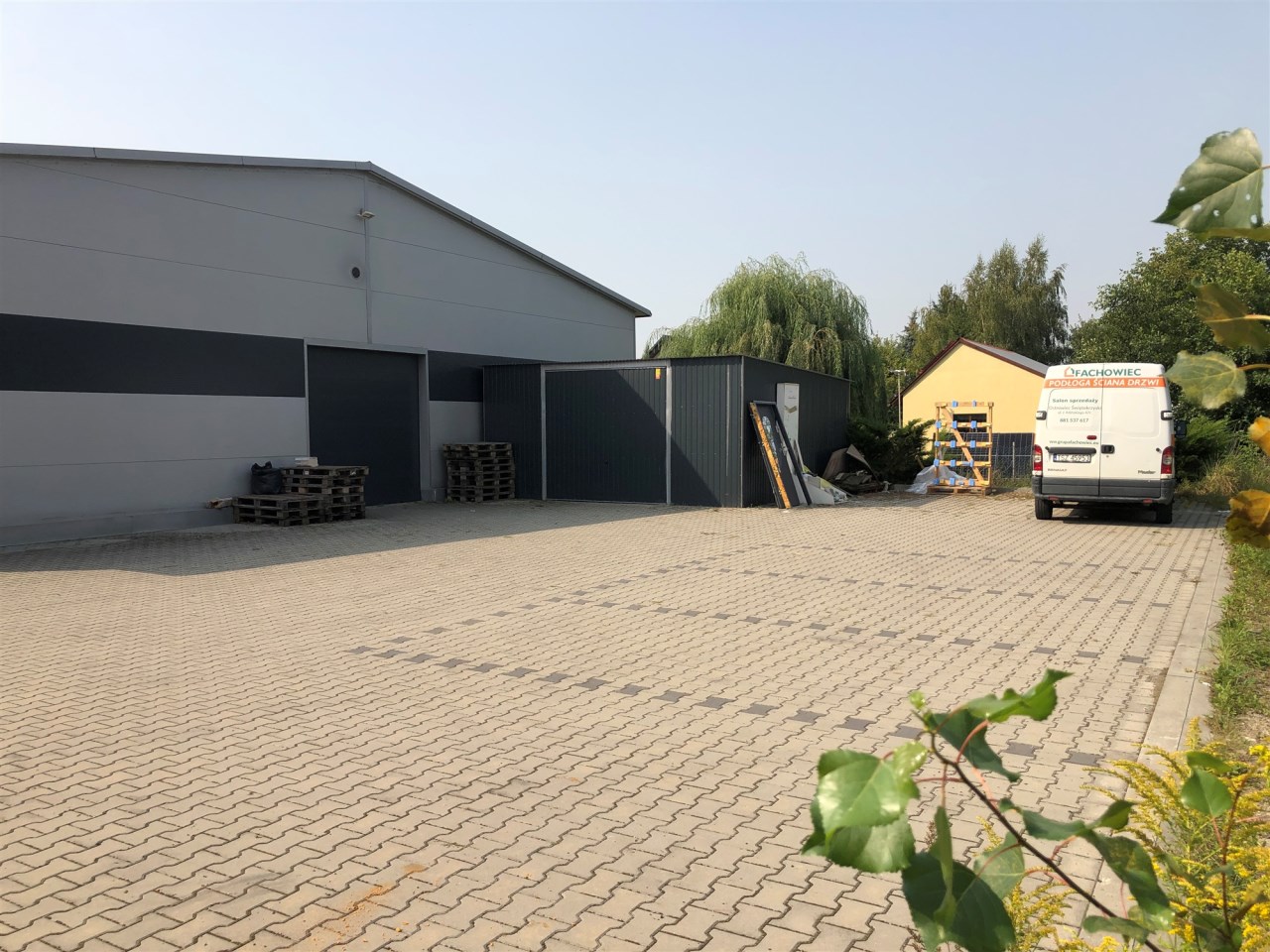 Wjazd na posesję oraz przejazd wzdłuż działki i plac manewrowy za budynkiem z kostki brukowej, za budynkiem także garaż metalowy magazynowy.