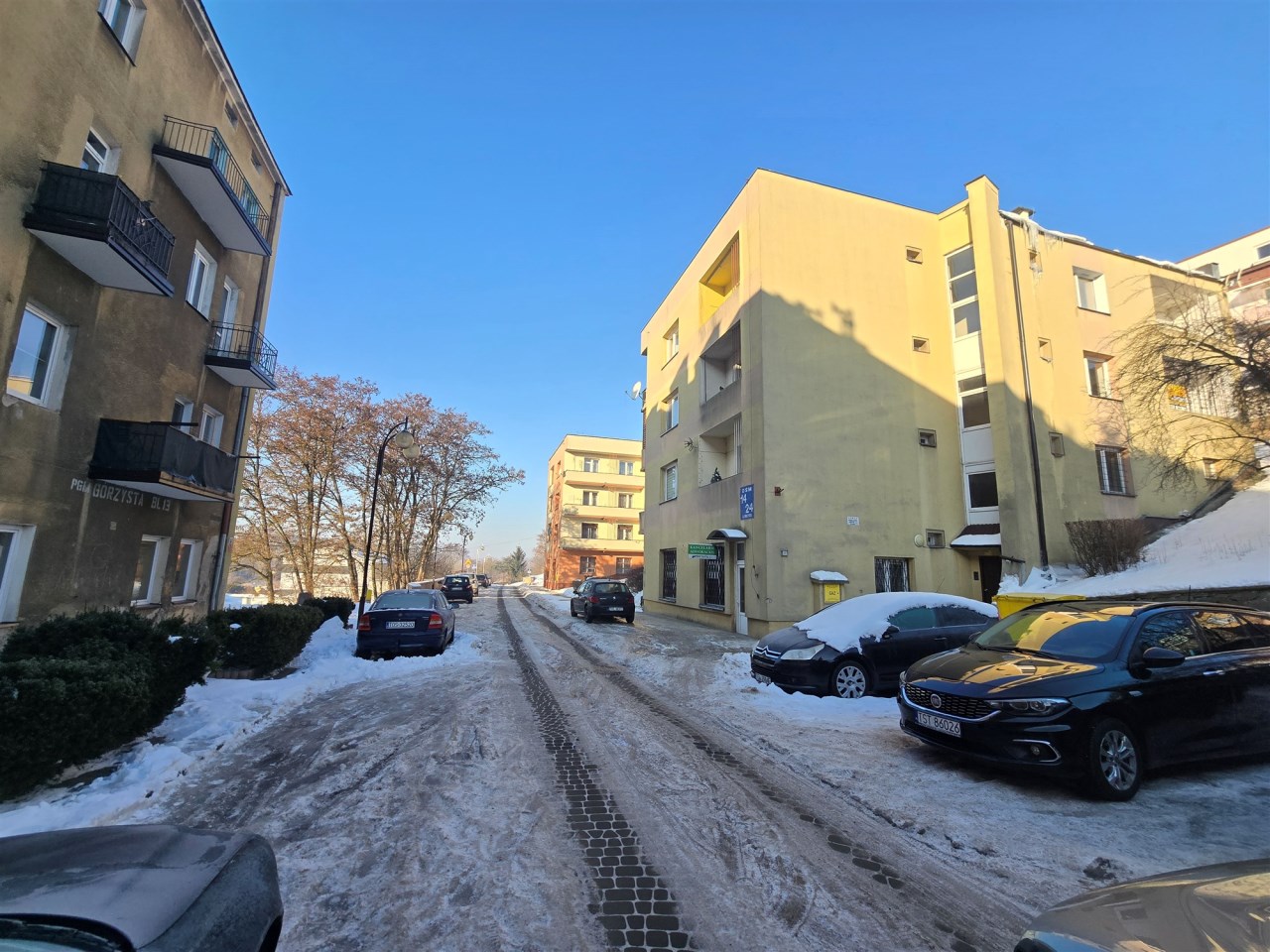Blok ocieplony, klatka z domofonem, spokojni sąsiedzi. Przed blokiem miejsca postojowe.