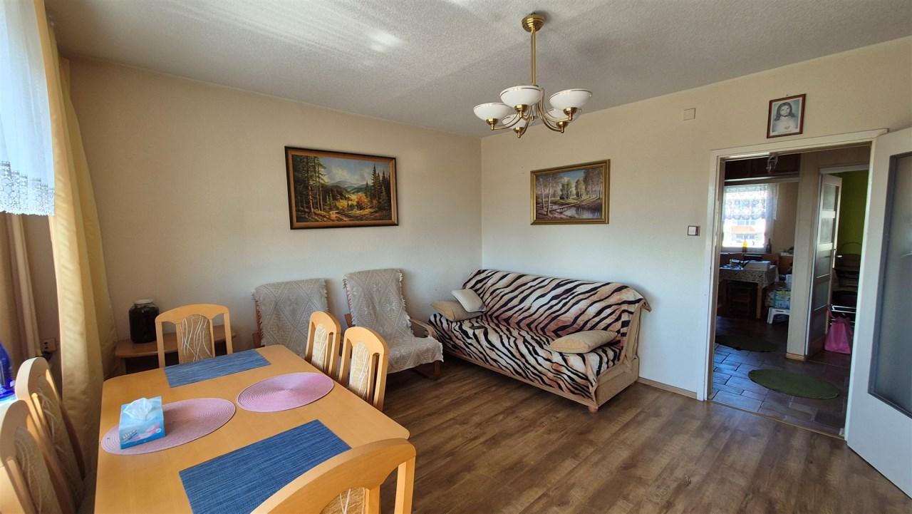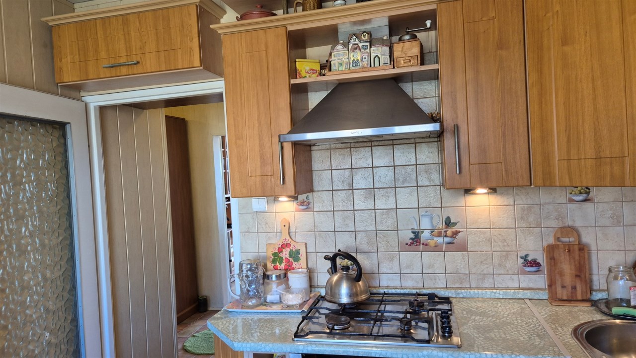 Okna PCV, panele i płytki, drzwi zewnętrzne w dobrym stanie, meble kuchenne w zabudowie.