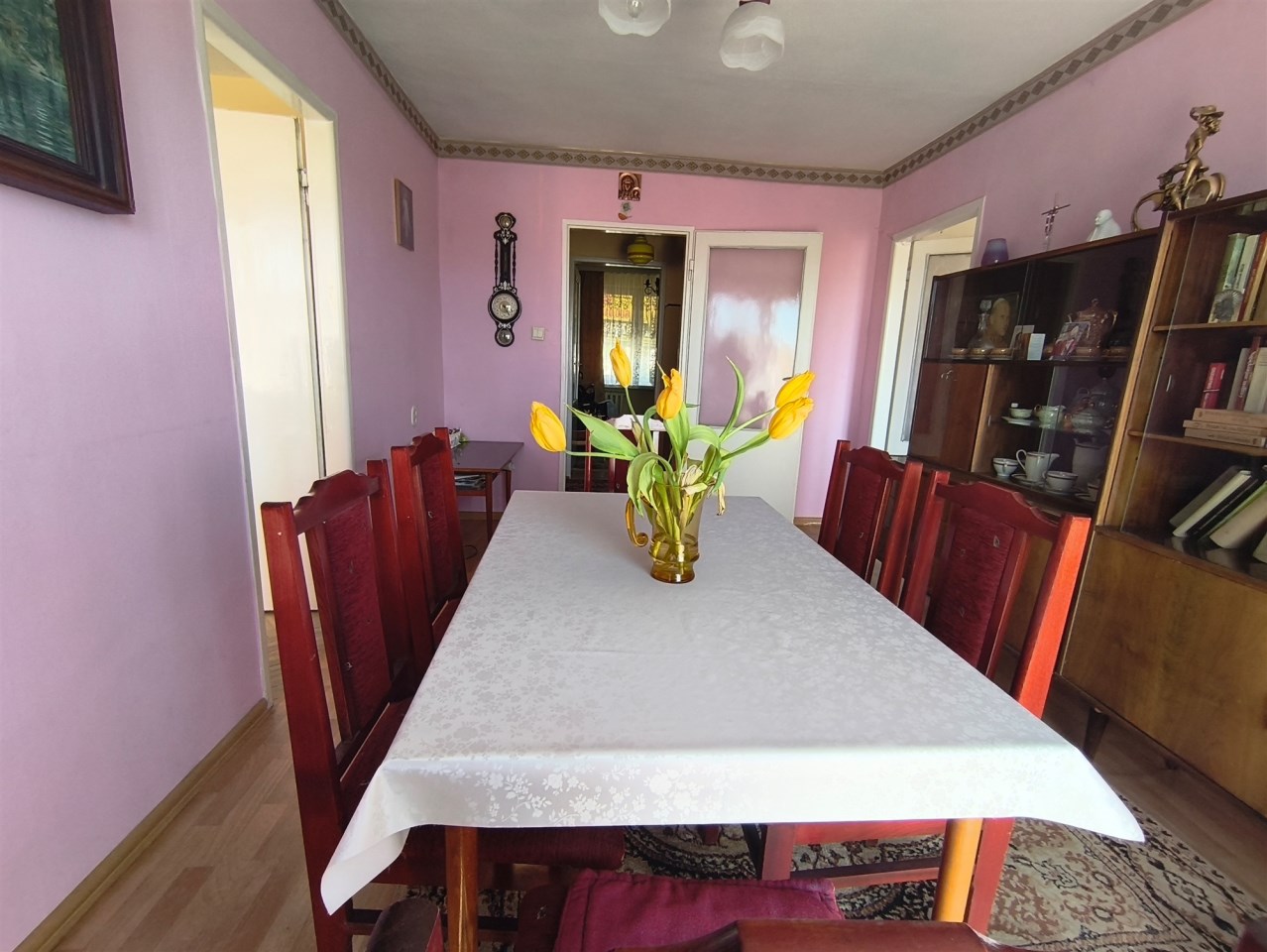 Okna PCV, na podłogach parkiet, panele i płytki.