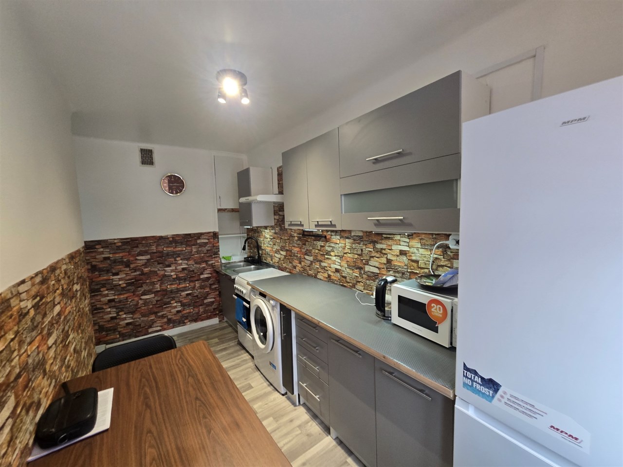 W kuchni lodówka, kuchenka gazowa, pralka, kuchenka mikrofalowa oraz możliwość podłączenia zmywarki.